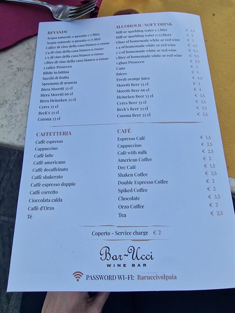 Wanneer je voor een wijntje per glas kiest, dan krijg je een handgeschreven blaadje wat door moet gaan als de wijnkaart, dat is toch weer die personal touch die het leuk maakt. Op dit blaadje staan een aantal opties van de dag, een paar rood, een paar wit en een rosé. Een Chianti Classico drink je hier voor 5 euro, de Riserva voor 6,-. De Nozzole is hier favoriet, doe er je voordeel mee.