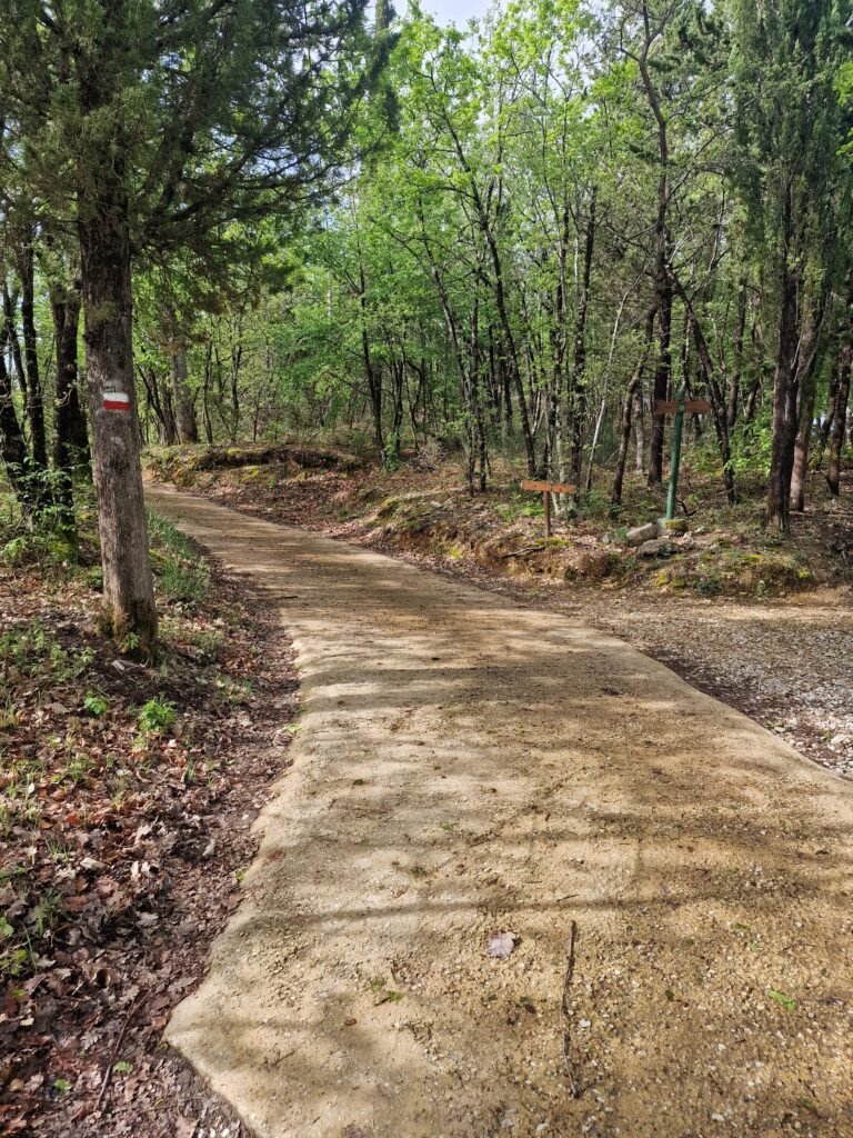 Dan kom je op de autoweg aan, welke je een stukje volgt tot je rechtsaf weer een bospad in gaat. Ook nu weer mooie uitzichten op wijngaarden en olijfgaarden zo ver je kan kijken.
