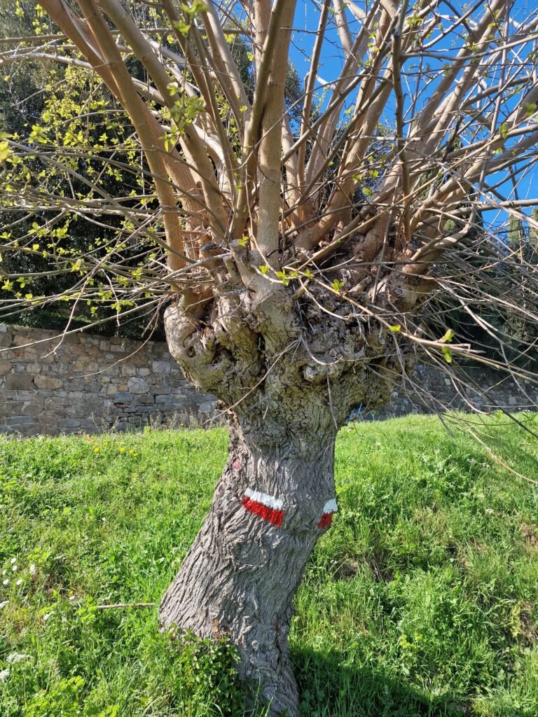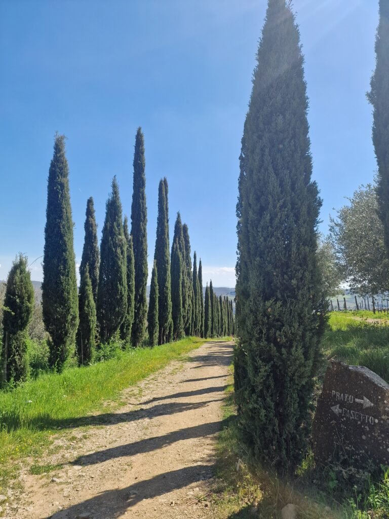 Daar gaat een rotsachtig pad de berg af. Al snel loop je ontzettend mooi tussen de hoge cipresbomen en in de verte zie je overal wijngaarden. Dit eerste gedeelte van de wandeling is misschien nog wel het mooiste van de hele wandeling! Vergeet niet te genieten!
