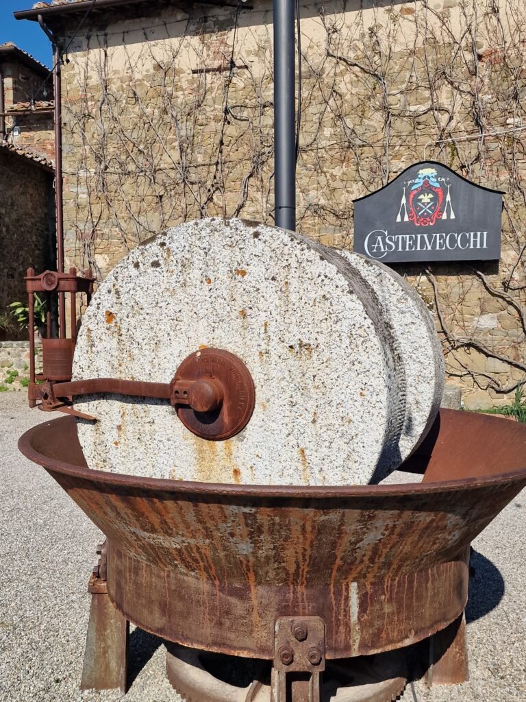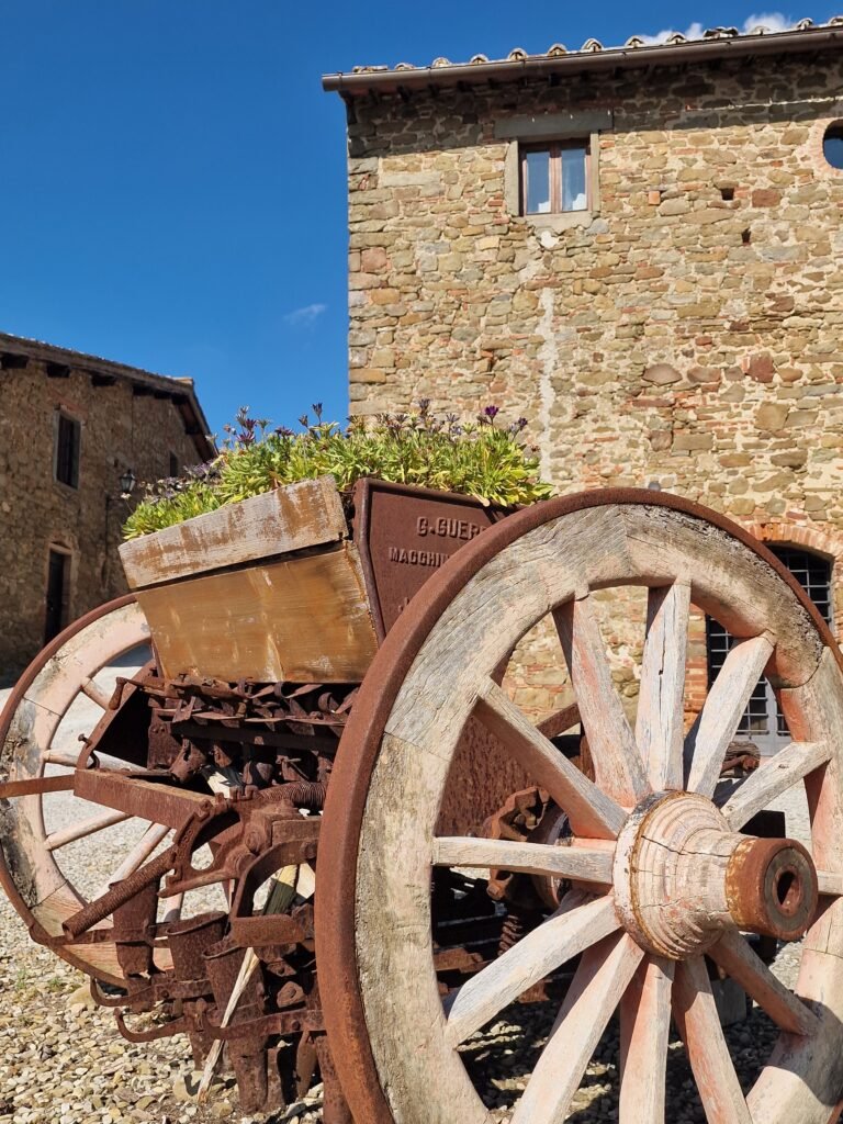 Vervolg de route naar links, waar de route dood lijkt te lopen tegen een hek waar een wijngaard achter ligt. Erg verwarrend, en de pijl is hier ook onduidelijk, maar open het hek, loop naar binnen en sluit het hek weer achter je. Loop naar rechts over het pad omhoog tot je bij wat oude panden aankomt en je nog wat verder door kan wandelen tot het schattige Castelvecchi. Niet meer dan een paar huizen, maar toch heel gezellig met de aankleding van wijntonnen en een restaurantje op het pleintje.
