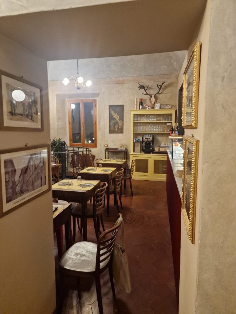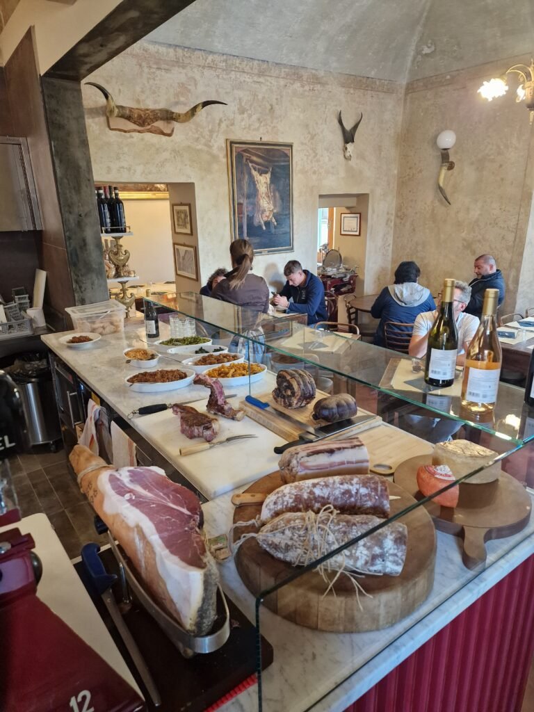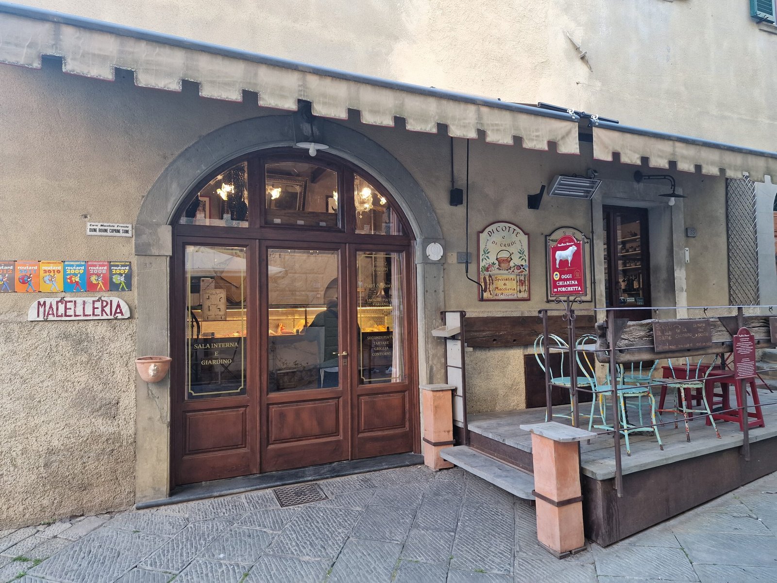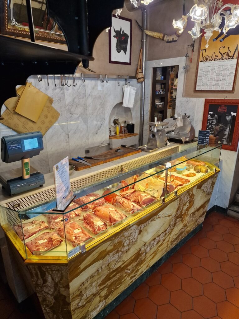 Het is even zoeken hoe het hier werkt bij deze slagerij, maar ik help je graag op weg! Je hebt 2 mogelijkheden om naar het kleine restaurantje te komen. Wanneer je de ingang via de hoofdstraat binnen loopt zie je 2 grote vitrines. De ene is gevuld met heerlijke prosciutto, mortadella en andere vleeswaren, en aan de andere kant is echt een slagerij gedeelte met grote stukken vlees. Wanneer je vervolgens links de wenteltrap naar boven neemt, kom je in een knus restaurant gedeelte. Bij mooi weer kun je ook buiten op het terras zitten maar voor de echte beleving zit je binnen en zie je het vlees op de grill bereid worden. De andere mogelijkheid is om via de achterkant naar binnen te lopen, wanneer je vanaf het pleintje bij de toren aan komt lopen. Maar het leukste is toch wel om via de slagerij binnen te lopen.
